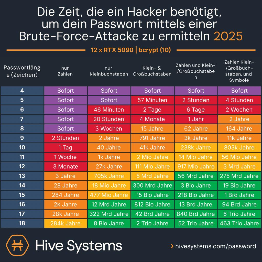 Hier eine Übersicht über den Zeitaufwand, den ein Hacker benötigt, um Ihr Passwort zu knacken: